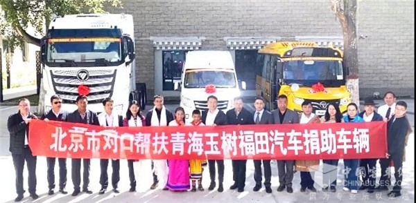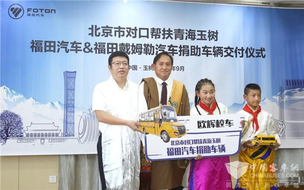 2020年9月17日,“北京市对口帮扶青海玉树福田汽车&福田戴姆勒汽车捐助车辆交付仪式”在青海玉树举行。活动现场,福田汽车向玉树交付欧辉校车等产品,帮助当地持续提升生活品质、改善教育环境,用朴实的行动和无私的爱为新玉树经济社会全面发展提供持续助力。