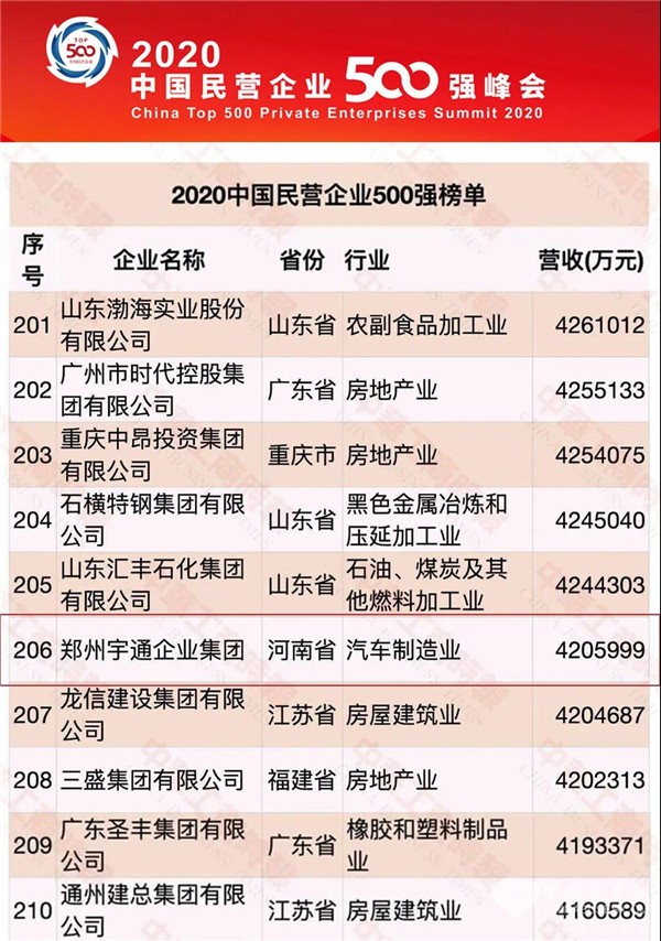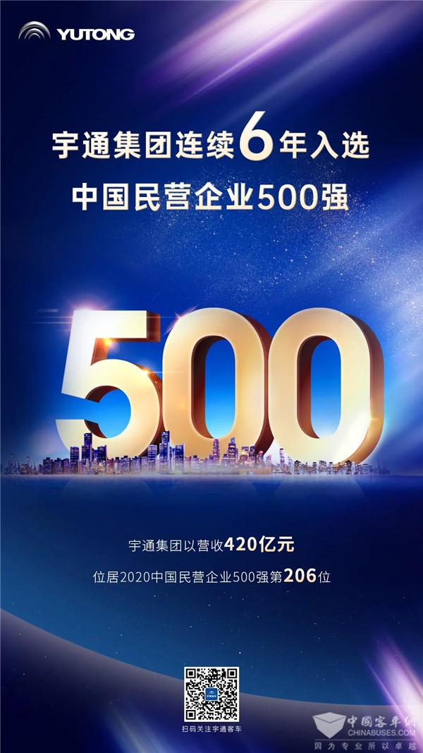 宇通六年来连续登榜中国民营企业500强,也充分彰显了宇通非凡的企业实力和品牌影响力。