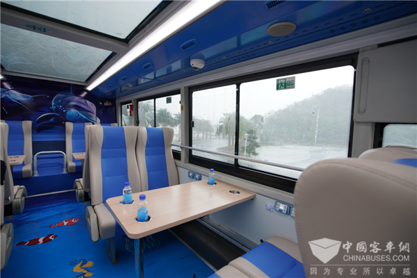 车辆采用一级踏步设计,配备加强芯扶手杆,让乘客上下车更安全更方便;车内配置导览显示屏、GPS景点定位系统、8国语音播报系统,既可以实时提醒、展示沿途的风景名胜,也可以通过语音实时播报景点信息,更可以打破语言隔阂,实现赏景无国界化;USB充电口、智能售卖机、物品展示柜……对于旅游的人来说,双层巴士将成为旅游观光、休息补给、感受城市文化的最佳选择。