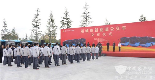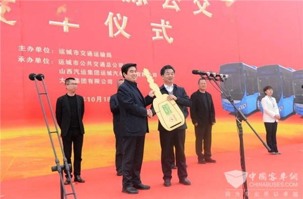 仪式上,大运集团董事长远勤山向山西汽运集团运城公司董事长张欢照交授车辆钥匙,寓意着将大运新能源公交车成功交付。