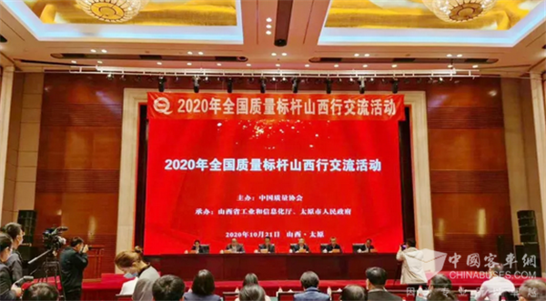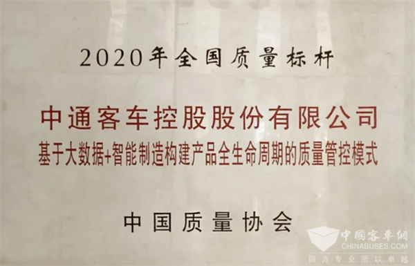 2020年10月21日, 2020年度“全国质量标杆”授牌仪式在山西省太原市举行。中通客车凭借“实施基于大数据+智能制造构建产品全生命周期的质量管控经验”正式获评“2020年全国质量标杆”荣誉。