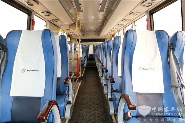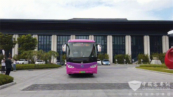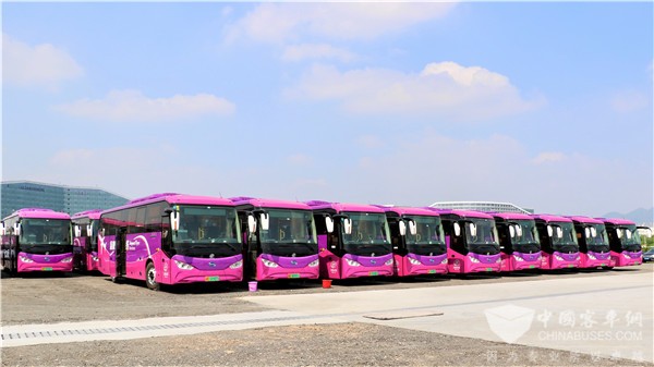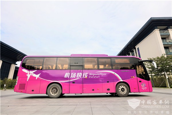 该批车辆采用统一的飞机展翅飞翔式涂装,粉紫配色亮眼独特,前脸轮廓鲜明,车身线条流畅,两门气动外摆,外观设计简约大方、新颖时尚;在内部空间上,宽大的车体和座椅的合理布局可让乘客享受宽阔的肢体伸展空间,车内配置高端乘客座椅、乘客呼叫系统、主动安全防御系统及视频实时传输系统等高端商务科技设施,尽显“以人为本”的设计理念,彰显豪华纯电动大客车风范。