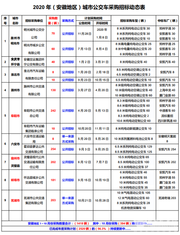 附:2020 年1-10月(安徽地区)城市公交车采购招标动态表