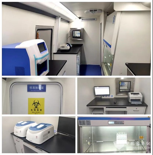 中通核酸检测车严格按照生物安全实验室P2+要求进行设置,具备新冠病毒等病原微生物核酸和抗体检测能力。可实现5G数据实时传输,极大提升疫情检测和相应处置效率。车内试剂准备区、标本制备区、扩增区三区加装加缓冲间,分工明确,检测效率高,具备单日10000人份样本检测能力。同时,采集检测一体化,至少可节省2个小时的报告出具时间。
