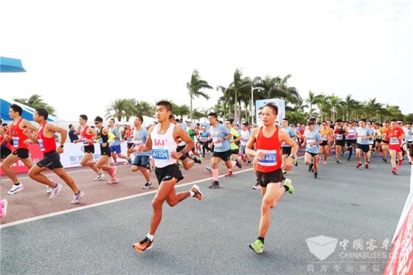 秋天的清晨,温和的阳光铺洒在红蓝赛道上,跑者们以美峰公园为起点,迎着海风快乐奔跑。当天,特别“领跑员”,中国第一款量产的L4级无人驾驶巴士金龙阿波龙现身跑道,成为赛场一道亮丽的风景。
