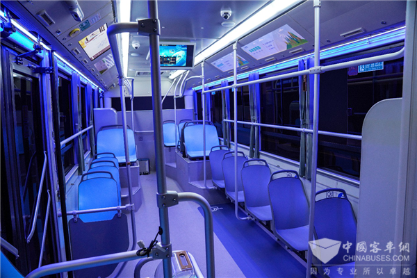 如何让人们爱上乘坐公交?首先要消除空间的压抑和拥挤感。北极星采用超短前悬、长轴距、全平地板设计方案,提升了车内的容量,8米8车型基本能达到10米5传统公交的载客量,不仅解决了公交潮汐现象带来的客流反差大问题,也改善了人们的日常乘坐空间。此外,通过增加两侧车窗的面积,让车内更加通透,减少了压抑感。车内可以自动亮起的蓝色氛围灯带,也是为了改善夜间公交车的乘坐体验。