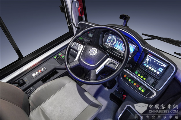 全数字仪表的12.3寸液晶显示屏上,可以同时显示大量的车辆信息和提醒装置,车门开启后大屏自动切换到车内监控,让驾驶员对于每一站乘客的上下车情况了如指掌。驾驶员还可以通过大屏实时了解到车辆及动力电池的各项信息。