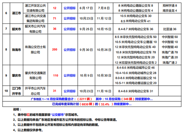 招标研究:2020 年1—10月广东地区公交客车招标汇总参考