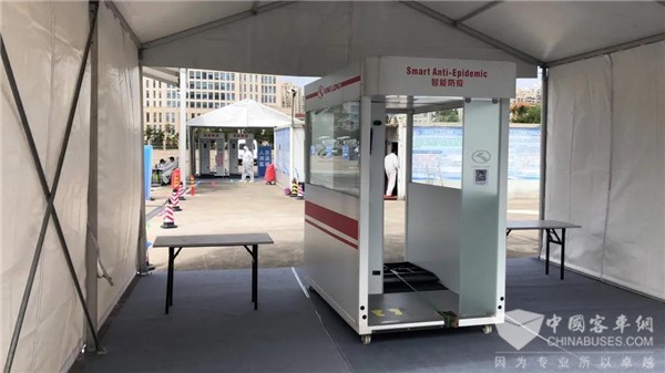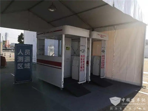 在世界疫情仍然蔓延时举办的大型盛会,各方面防疫措施异常严密。在龙华中路进博会服务保障车辆临时停车场内,车辆安全消毒、人员测温区域、应急隔离专用车道、疑似感染车辆停放区、快捷通道车辆停放区,每个区域都按照车辆行进路线,进行严格的区域划分,确保及时应对防疫防控需求以及各类突发情况。特别值得一提的是,两台金龙客车智能防疫站在此上岗,以智慧高效把守人员出入防疫第一关。人员测温通过,仅需10秒。在测温的同时,还能完成手部消毒、喷洒消毒液、提醒佩戴口罩等一系列防疫项目。智能防疫测温机兼备“自动测温+免洗消毒”两大功能,既降低了工作人员的劳动强度,又能高效的管控停车场进出人员,进一步保障了场地和人员的安全。