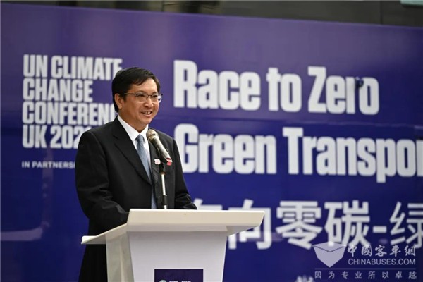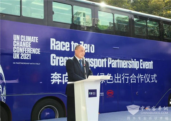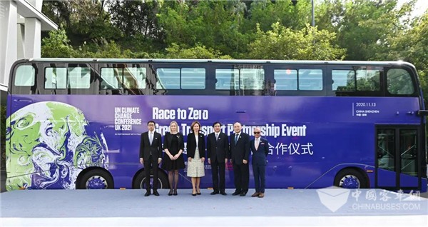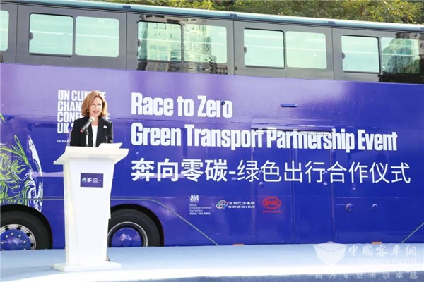 2020年11月13日上午,受新任英国驻华大使吴若兰女士(HMA Caroline Wilson CMG)邀请,英国驻广州总领事馆联合比亚迪及深圳巴士集团,于深圳莲花山公交总站举行“奔向零碳——绿色出行”合作仪式。活动旨在为即将在英国召开的第26届联合国气候变化大会(COP26)发声,号召和鼓励更多群体响应并支持大会提出的应对气候变化的倡议。