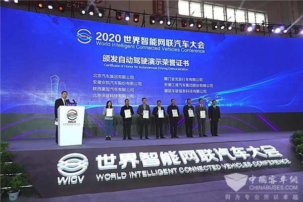 同时在当天的2020世界智能网联汽车大会闭幕式上,工业和信息化部领导为安凯客车颁发自动驾驶测评演示荣誉证书。
