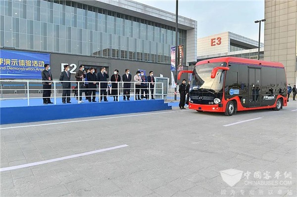 图 | 工业和信息化部党组成员郭开朗观看安凯无人驾驶客车现场演示