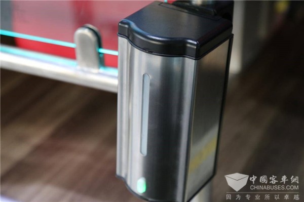 当我们进入车厢内部的时候可以看到有两组设备,第一组的体温检测报警系统。还有一组就是带有红外感应的自动洗手消毒机,这两项配置应该是防疫常态化的装备。