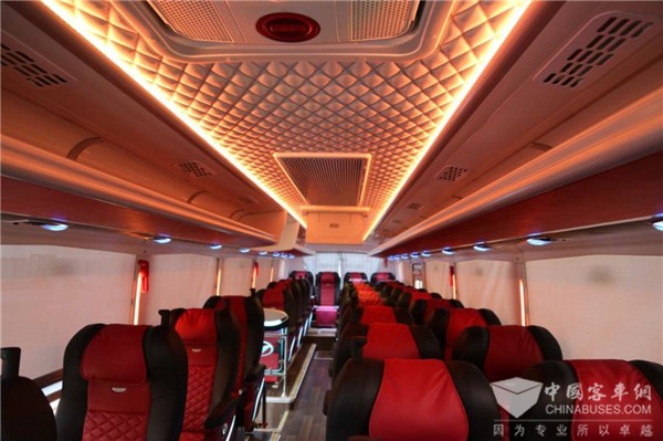 车厢内部采用了右1左2的座椅布置形式,所有座椅均采用了酒红与雅黑双拼的高端软座。座椅左右两边均设置了扶手,前部还设置了脚托,可以根据乘客的需求来进行角度调节。