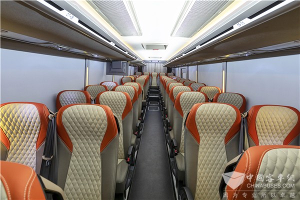 High时尚。超级大巴H12外形由欧洲著名设计公司倾心打造,大量选用欧洲潮流元素和配色风格,内饰采用全新色彩搭配,顶部内置氛围灯,创造居家式温馨乘车环境,体现了H系列车辆的高贵风范。