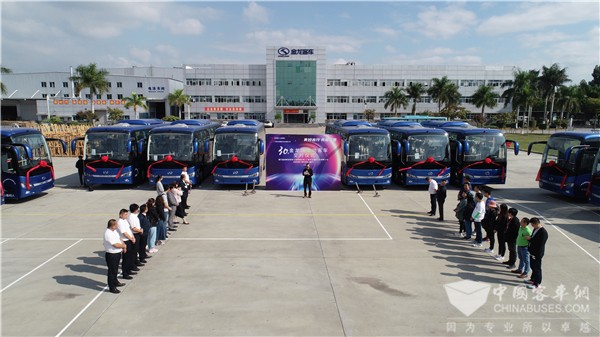 2020年11月28日,30辆美观大气的金龙纯电动XMQ6112交付“老朋友”广州交通旅行社,这是双方合作十余年来首次交付的大批量纯电动订单,这将助力广州交运集团业务升级,赢运旅游通勤市场。