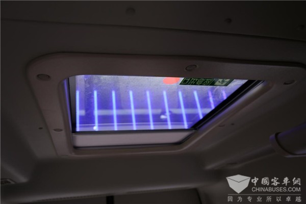抬头一看可以发现海格睿星竟然还带有天窗设计,在同级别的轻客里这个设计相当少见。天窗提高了车内的采光,让车厢内部更加敞亮,使得乘客的心情更加愉悦。天窗在应急情况下还可以作为逃生窗,真是一窗两用。