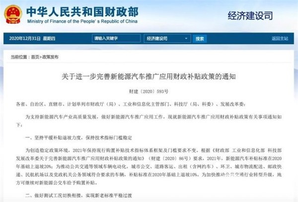 2020年12月31日,财政部联合工信部、科技部和发改委(常称“四部委”)发布《关于进一步完善新能源汽车推广应用财政补贴政策的通知》(财建【2020】593号,下简称“通知”), 业内也将其称作“2021年新能源汽车补贴新政”。