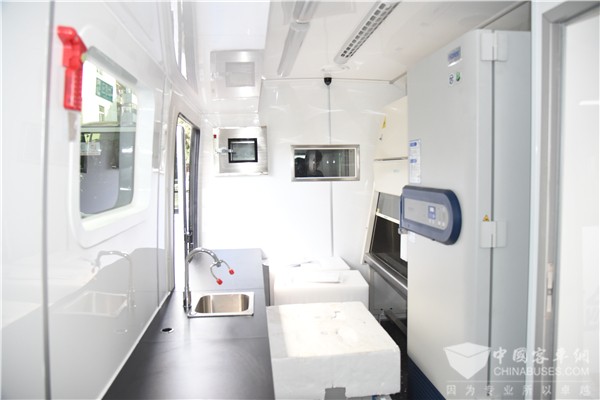 车辆按照移动式实验室生物安全要求设计,在空间上设置试剂储存和准备区、标本制备区和扩增产物分析区三个区域,具备从样本采集、样本前处理,自动化核酸提取、核酸检测及分析,到最后输出报告全部流程的功能,能够安全且有效地完成核酸检测任务。金龙核酸检测车配备实验室送排风系统、压力控制系统及先进的监控与通讯系统,为实验安全有序地进行提供良好硬件设施保障。