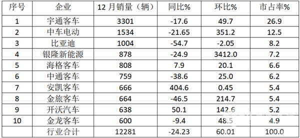 12月新能源客车销量:宇通、中车、比亚迪组成“千辆头部俱乐部”,领跑行业