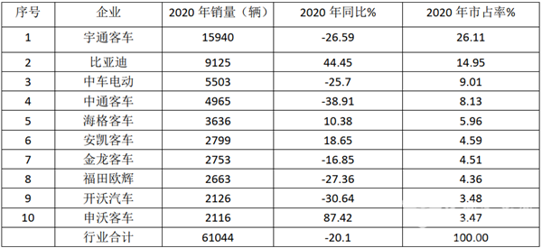 2020年1-12月全年新能源客车累计销量前10名企业:依次为宇通客车(15940辆)、比亚迪(9125辆)、中车电动(5503辆)、中通客车(4965辆)、海格客车(3636辆)、安凯客车(2799辆)、金龙客车(2753)、福田欧辉客车(2663辆)、开沃汽车(2126辆)、申沃客车(2116辆)。