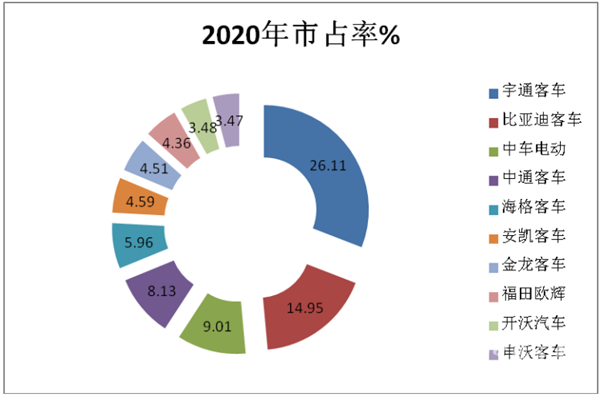 2020年TOP10中,宇通是唯一销量超过15000辆,占比超四分之一份额(26.11%)的企业,可谓遥遥领先,独占鳌头;