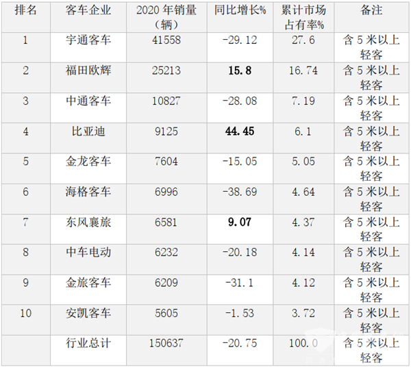 结束语:纵览2020年我国客车市场,全年5米以上客车销量150637辆,同比下降20.75%;从竞争层面看,宇通、福田欧辉、中通客车居前三甲;从同比增速看,比亚迪增速最快,表现最亮眼;2021年竞争格局如何,总体趋势如何发展,让我们拭目以待!