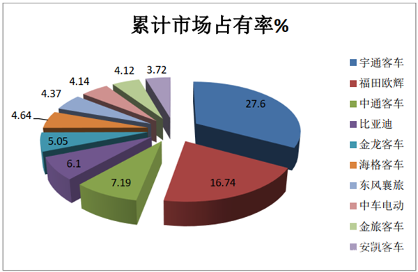 比亚迪累计销量9125辆,同比大增超4成(44.45%),增幅在行业中处于最大,市场份额6.1%,表现最亮眼;行业关注的“三龙”客车(厦门金龙、海格客车、厦门金旅)全部进入前10名,累计销量分别为7604辆、6996辆和6209辆,同比增幅分别为-15.05%、-38.69%和-31.1%。分别位居行业第5、第6和第9名,“三龙”总体实力仍然不容小视。