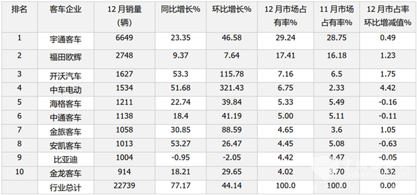 宇通稳销量6649辆,环比增长46.58%,同比增长23.35%,环比、同比均增长,市场份额为29.24%,且环比市占率增加0.49个百分点,居于榜首,强者更强特征凸显,不愧为行业老大,为促进12月客车行业的环比增长和市场的持续向好发挥了至关重要的龙头作用;福田欧辉居第二,销量2748辆,同比增长9.37%,环比增长7.64%,也是环比、同比均实现增长的企业,市场份额为16.18%,占比环比增加1.23个百分点,稳居于第二,表现不俗;开沃汽车销量为1627辆,同比大增超5成(53.3%),环比大增115.78%,市占率为7.16%,占比环比增加1.75个百分点,跃居行业第三,表现非常亮眼;