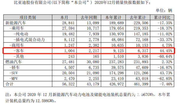 岁末年初,国内各大车企纷纷亮出自己的年终产销数据,比亚迪新能源客车销售表现可谓成绩喜人。近日,比亚迪股份有限公司发布12月及全年销量快报。数据显示,2020年1-12月累计销售客车9125辆,同比大涨44.45%。