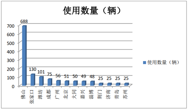 在2020年燃料电池汽车使用城市中,佛山以688辆的使用数量占据第一;张家口以130辆的使用数量占据第二;潍坊以101辆的使用数量占据第三;其余城市使用数量均在100辆以下。