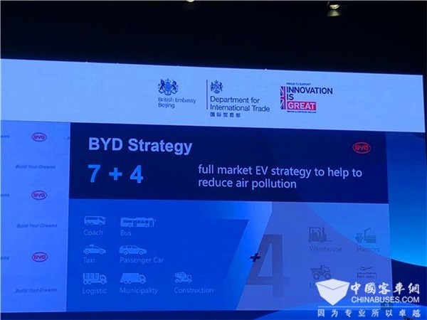 2015年,比亚迪提出7+4战略,以期实现全场景电动化,包括电动旅游大巴、城市公交、出租车、私家车、城市商品物流、城市建筑物流、环卫车,以及在港口和仓储、机场、矿山等领域所使用的电动车辆,实现全领域覆盖。
