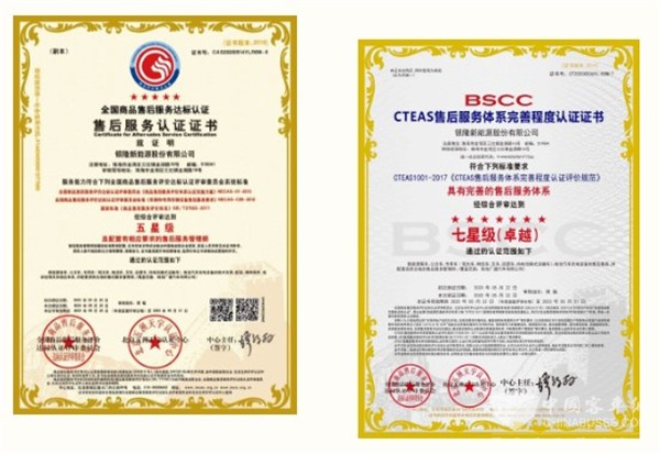 银隆新能源荣获“CTEAS售后服务体系完善程度认证七星级(卓越)认证”、“CAS售后服务认证五星级”等多项荣誉,被誉为行业内售后服务典范……
