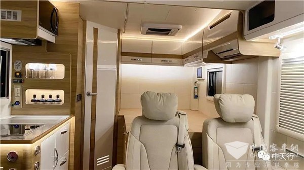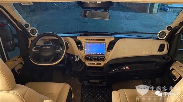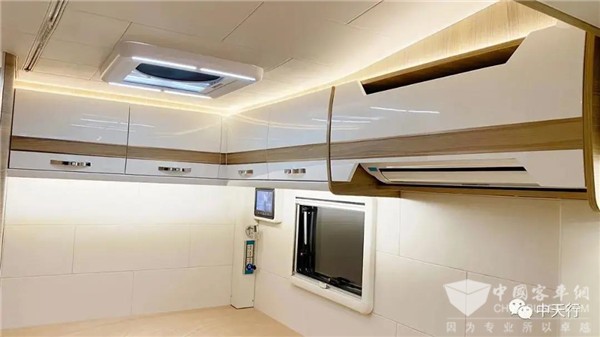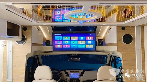 小额头造型取消了额头床,顶部大天窗可减小风阻,增加车内采光,额头两侧设置了两个储物柜,中部是一台34寸的三星4K液晶显示屏,背部则有与显示屏配套的小米盒子,显示器下方还有一条隐私帘轨道。整车的DSP八路功放,低音炮,深受音乐发烧友喜爱。