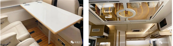 车厢中部是休息就餐区,2个航空座椅带通风、按摩、加热功能,主驾驶后方设置了一个类似长条凳的设施,既可充当脚托也可以当临时休息座位。中部餐桌上还设计了两个杯架,可在行驶途中固定水杯。上方是双人电动升降床,床底部迈巴赫顶灯高雅大气。