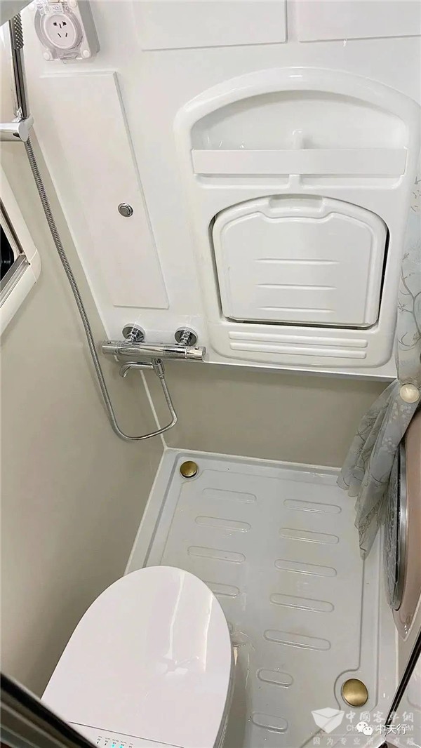 卫生间位于厨房边上,排风扇(电控、雨感、温控、遥控)、淋浴花洒、毛巾架、折叠洗手盆、赛特福德电排马桶、电动马桶盖等配置齐全,还安装了进口大宇3公斤洗衣机(带烘干)。全车冷热水龙头,沐浴恒温混水龙头设计。