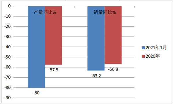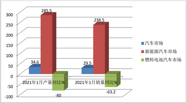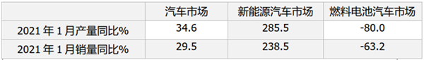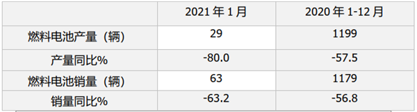根据中汽协数据,2021年1月我国汽车总体产销分别完成238.8万辆和250.3万辆,同比分别增长34.6%和29.5%,其中新能源汽车分别完成19.4万辆和17.9万辆,同比增长285.5%和238.5%,可见无论是汽车整体还是新能源汽车细分领域,均实收获了2021新年“开门红”,然而燃料电池汽车并未出现“开门红”。中汽协数据显示,2021年1月我国燃料电池汽车(主要是客车,下同)产销分别完成29辆和63辆,同比大降80%和63.2%。