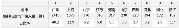 2020年氢燃料电池汽车接入量top10省市(数据来源:国家监管平台)