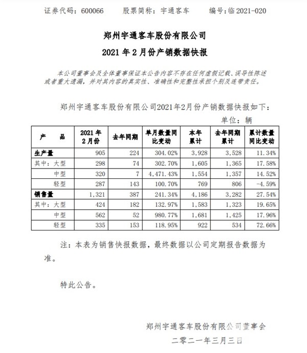 2021年3月3日,,郑州宇通客车股份有限公司发布了2021年2月份产销数据快报。数据显示,2021年2月份,宇通客车生产大、中、轻型客车905辆,同比增长304.02%;销售各型客车1321辆,同比增长241.34%。2021年1-2月,宇通客车累计生产各型客车3928辆,同比增长11.34%,累计销售各型客车4186辆,同比增长27.54%,产销两端均实现大幅正增长。