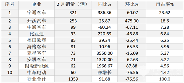 总体看,2021年2月TOP10中,同比9增1降,多家欢喜少家愁。从市场排名看,宇通客车以大涨近4倍的业绩位居第一,开沃汽车跃居第二;中通客车位居第三;行业销量1359俩,同比大涨超9成(91.68%)。