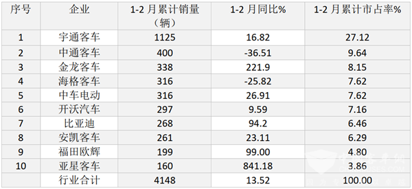 2021年1-2月新能源客车累计销量前10名企业依次为宇通客车(1125辆)、中通客车(400辆)、金龙客车(338辆)、海格客车(316辆)、中车电动(316辆)、开沃汽车(297辆)、比亚迪客车(268辆)、安凯客车(261辆)、福田欧辉(199辆)和亚星客车(160辆)。