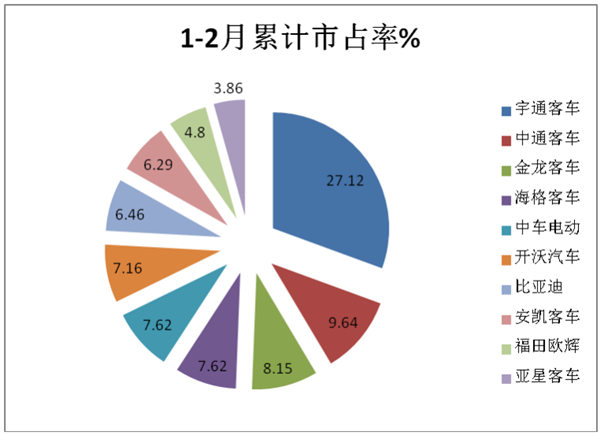 前2月TOP10中,宇通是唯一累计销量超过1000辆,占比超四分之一份额(27.12%)的企业,可谓遥遥领先,独占鳌头;而中通客车是销量唯一达到400辆的企业。
