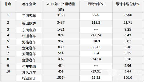 根据中国客车统计信息网数据,2021年1-2月5米以上客车top10销量排行: