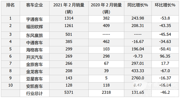 根据中国客车统计信息网数据,2021年2月5米以上客车TOP10销量排行: