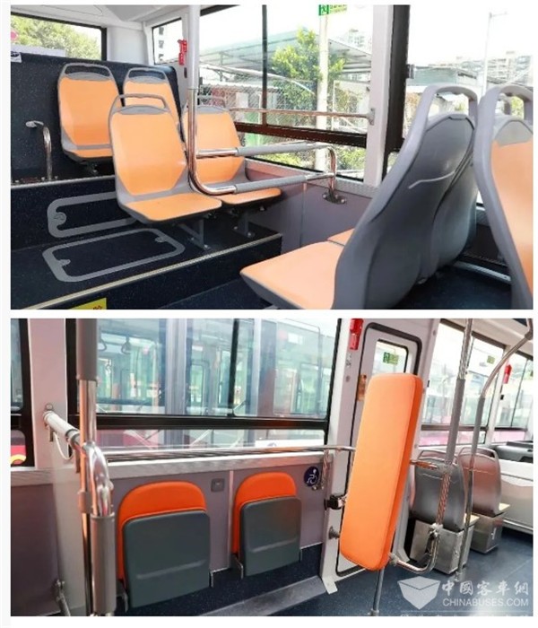 此外,整车三车门,均为双引道车门,门开净宽度达到1200mm,并配置翻转踏板,实现乘客无障碍上下车。