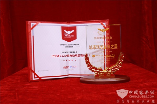 B12D是比亚迪商用车于2020年7月重磅发布的全新一代纯电动客车产品,该车融合国际化设计理念,凸显人文关怀与时尚科技的相互交融,实现了从外观造型到核心技术的全面革新。在本次颁奖典礼上,比亚迪B12D纯电动双层观光巴士正是凭借高颜值、高性能、高品质荣获影响中国客车业 “城市观光客车之星”大奖。