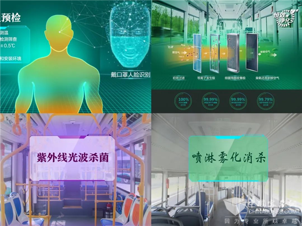 车辆搭载人脸识别体温检测系统、CEP等离子体空气净化系统、光触媒紫外线除菌系统、喷淋雾化消毒杀菌系统等核心技术,可深度净化空气中有害物质,全方位无死角的进行病毒消杀,以多重表面消杀技术,同时准确检测乘客体温情况,减少乘车安全隐患,适用于城市环路、快速路、主干道或跨市公共交通线路。2020年,银隆新能源恒效净化健康车项目成功入选珠海市社会发展领域科技计划项目名单,全面打造车内健康环境,保障公众的出行卫生安全,推动公共健康事业不断向好发展提供创新技术支持。