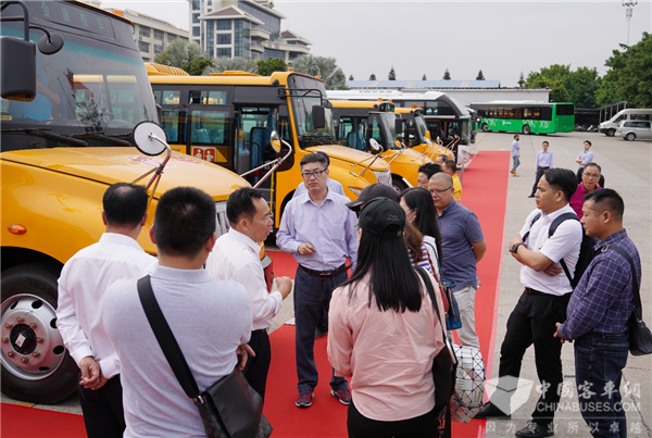 在考察参观过程中,各位嘉宾深入了解了金旅公司各方面的情况,包括技术研发、工艺革新和各类产品。校车项目部总经理谢世文陪同各位嘉宾参观了金旅海沧生产基地的生产线和金旅校车系列产品,对金旅新一代校车进行了详细介绍,并与大家进行深度交流。谢世文介绍,金旅校车采用金刚封闭环结构车身骨架+贯通式优质大梁+前后配备高强度防撞梁,做好被动安全功课,此外发动机舱智能灭火装置和安全带集中解锁、360度无盲区视野等功能的加持,做好全方位的呵护。金旅校车还采用二合一主机,将GPS行车记录仪与车载视频监控合二为一,实时查询校车位置、行驶轨迹等数据,让家长安心更放心。前方防撞报警、车道偏离预警、HWM车距检测警告、低速碰撞预警等系统,给车辆插上智能科技的翅膀。