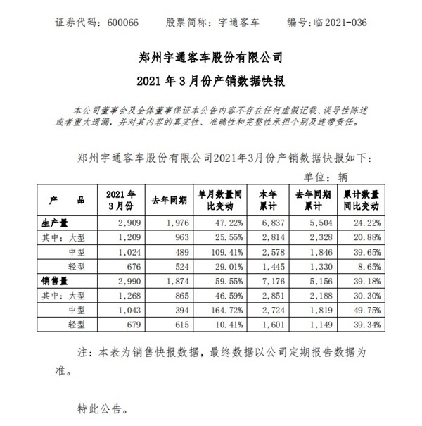 2021年4月2日晚,宇通客车披露2021年3月份产销数据快报。快报显示,2021年3月份,宇通生产大、中、轻型客车总计2909辆,同比增长47.22%;3月销售量2990辆,同比增长59.55%。