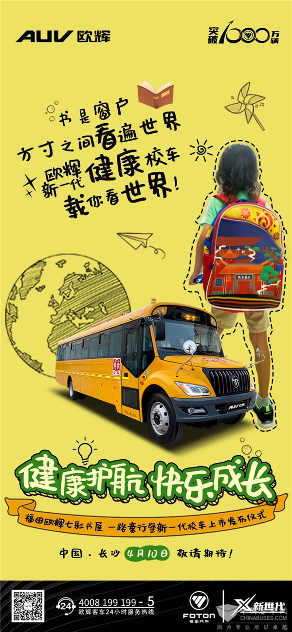 福田欧辉七彩书屋一路童行公益活动暨新一代健康校车上市发布活动将于2021年4月10日在长沙举行。此次活动以“健康护航 快乐成长”为主题,七彩书屋公益巡展活动将正式拉开帷幕。与此同时,汇集顶尖科技打造的福田欧辉新一代健康校车也将亮相潇湘大地。